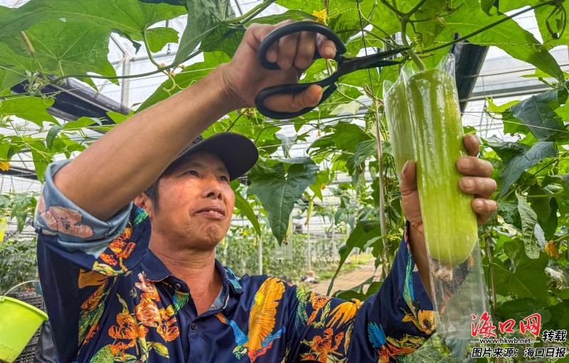 在琼山区三门坡镇大荒洋常年蔬菜基地,农户正在采摘白玉丝瓜。记者 康登淋 摄