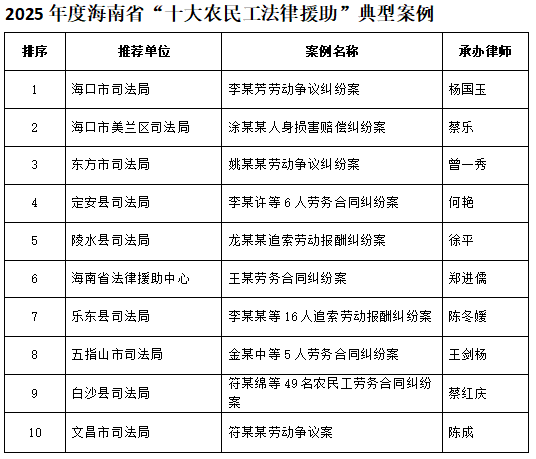 近日,记者从海南省司法厅获悉,2025年度海南省“十大农民工法律援助案例”评选结果公示期已满,此次评选活动由海南省法律援助中心举办,现正式对外发布。