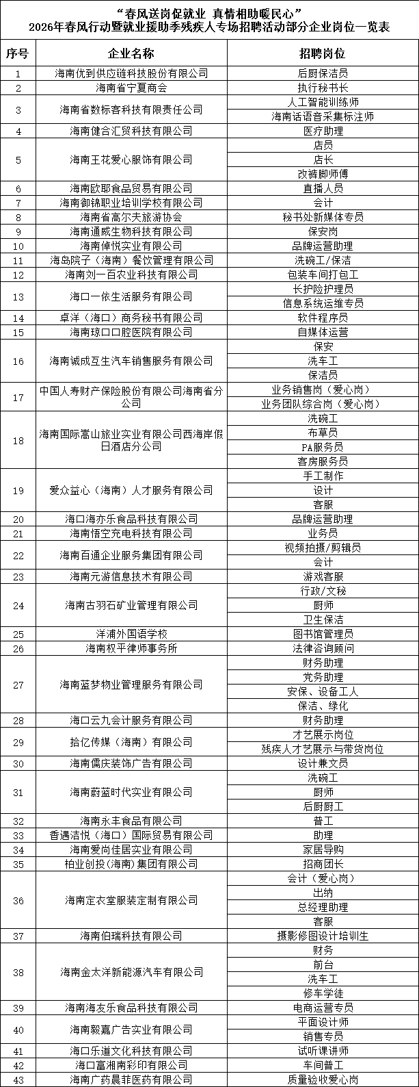 海口网3月10日消息(记者史子杨)由海南省残疾人联合会、海南省人力资源和社会保障厅、国家税务总局海南省税务局联合主办的2026年春风行动暨就业援助季残疾人专场招聘活动,将于3月13日上午9:00—12:00在省残疾人创业就业示范街(春天事业一条街)举办。