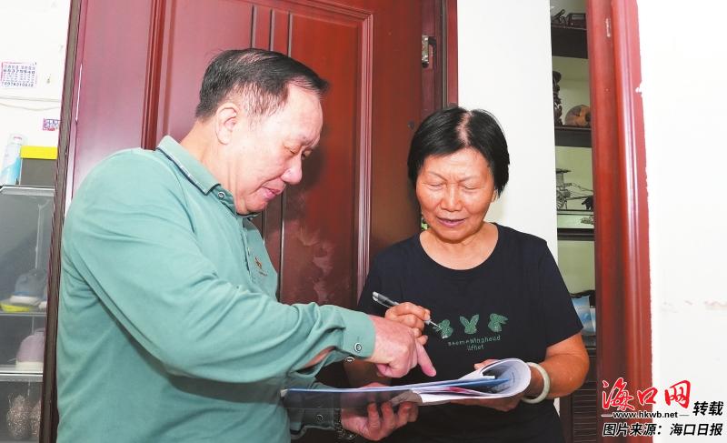 在美兰区海府街道军区二所小区,小区党支部书记余宗运(左)手持表决记录表,向业主讲解抄表到户政策,收集每一户的意见。记者 杨忠凯 摄