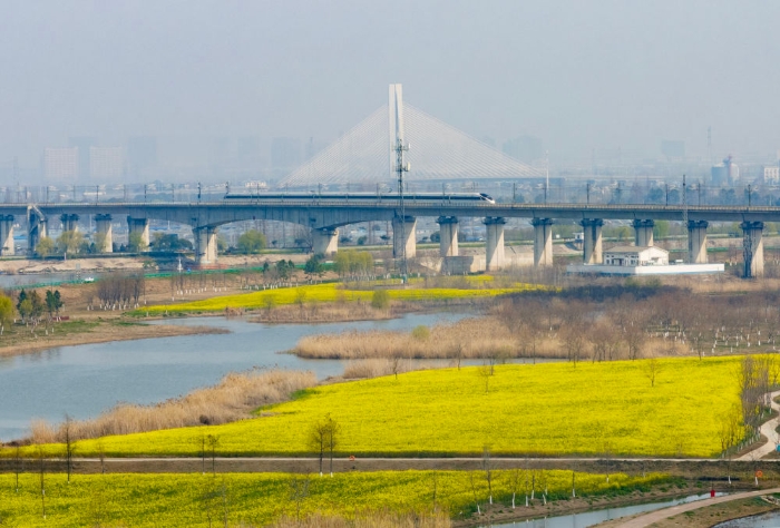 2026年3月11日,一列高铁列车穿行在安徽省合肥市肥东县十八联圩生态湿地(无人机照片)。新华社记者 杜宇 摄