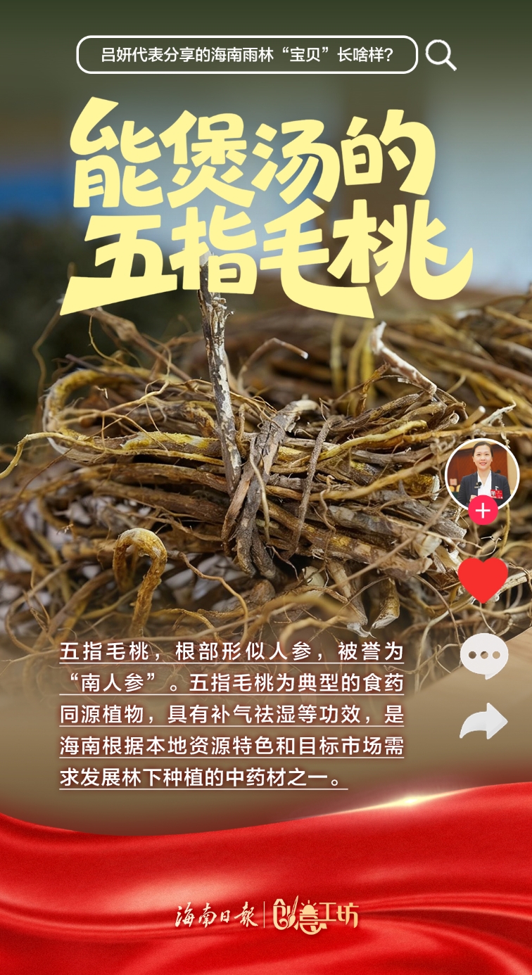 3月12日,十四届全国人大四次会议第三场“代表通道”在北京人民大会堂举行。全国人大代表,海南省保亭黎族苗族自治县委常委、副县长吕妍走上“代表通道”,向全国人民分享了海南雨林“宝贝”——能煲汤的五指毛桃、能做药的益智、会上树的鸡、不回家的牛、会冲浪的鱼、五只脚的猪。