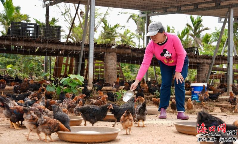 “我们成立了专业合作社,在小叶紫檀林地里套种斑斓,再采摘斑斓叶配制饲料养殖‘斑斓鸡’,走出了一条林下生态养殖的新路子。”3月13日,美兰区大致坡镇美良村的一片小叶紫檀林里,合作社成员郭小妹一边向记者介绍生态养殖模式,一边撒下饲料,成群的“斑斓鸡”飞奔而来进食,整个生态养鸡场变得热闹起来。