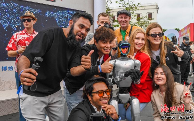 达人们在启动仪式现场与表演舞蹈的机器人合影。记者 康登淋 摄
