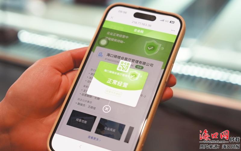 “您可以扫一扫二维码,查看商家信息。”在工作人员的指引下,消费者通过手机扫码,进入“放心消费在海南”小程序,查看了经营主体信息和信用等内容。上面显示,该店近一年内未被列入经营异常名录、未有行政处罚、未被列入有风险经营主体等相关信息。