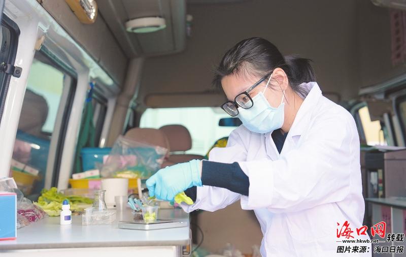 3月15日,省、市市场监管部门联合在海南万佳家居装饰广场开展宣传活动。图为工作人员在现场抽检蔬菜。记者 杨忠凯 摄