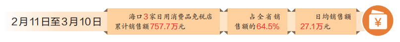 作为海南自贸港封关运作后,免税政策向民生领域延伸的重要举措,海口3家岛内居民日用消费品免税店错位布局、多点覆盖,与离岛免税形成互补,构建“游客畅购、居民乐享”的免税消费新格局。据统计,全市日用消费品免税店开业首月(2月11日至3月10日)累计销售额达757.7万元,占全省销售额的64.5%,日均销售额27.1万元。