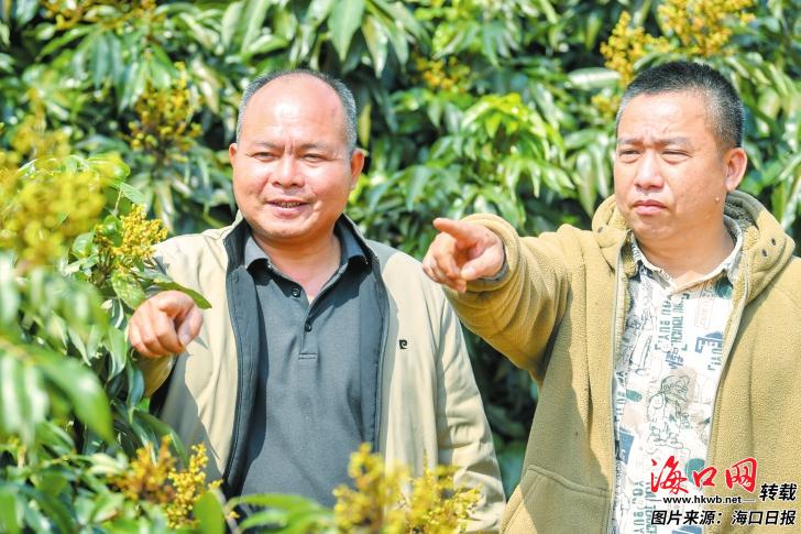 当天,在红明农场一队的荔枝新品种试验示范基地里,三门坡镇农业服务中心技术员邱海和海口金绿果水果产销专业合作社负责人王录理一起,仔细查看“桂花香”荔枝挂果情况。王录理既是荔枝种植“土专家”,也是带领当地荔农致富的“种甜人”。