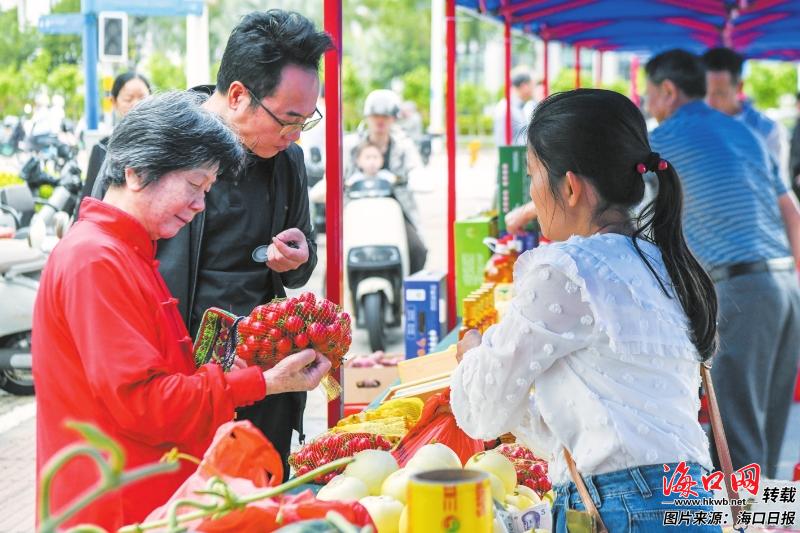 集市上,来自秀英区东山镇的泡椒、东方市的玉米堆成小山,引来市民争相挑选。“菜看着新鲜,是农户直供的,吃着放心,还能帮衬老乡。”市民张士梅一边挑选,一边说。