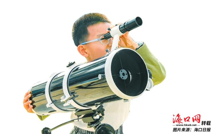 3月21日,在海南省气象预警中心及海口综合气象观测站内,小朋友通过天文望远镜进行观测。记者 康登淋 摄