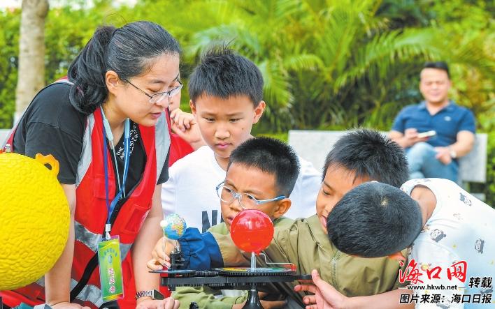 工作人员向小朋友讲解天文知识。记者 康登淋 摄