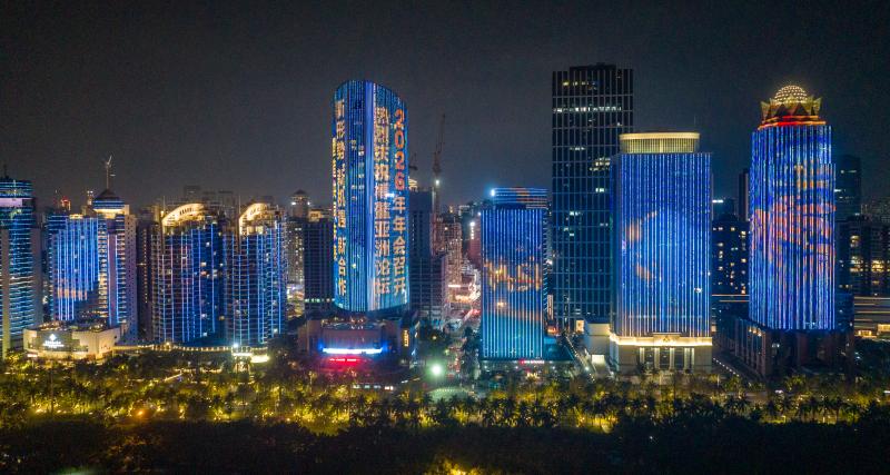 3月22日晚,海口滨海大道沿线楼宇点亮博鳌亚洲论坛年会主题灯光秀。璀璨的光影在夜色中交织铺展,以独具椰城特色的城市夜景,迎接即将召开的博鳌亚洲论坛2026年年会。