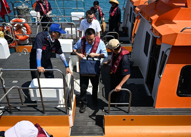 ↑ 3月19日,乘客乘坐海上交通保障船由海南三沙永兴岛前往赵述岛。