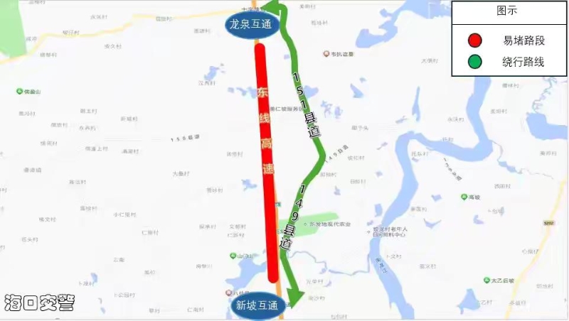 如东线高速龙泉互通至新坡互通车流量大,建议途经车辆绕行151县道⇆149县道。