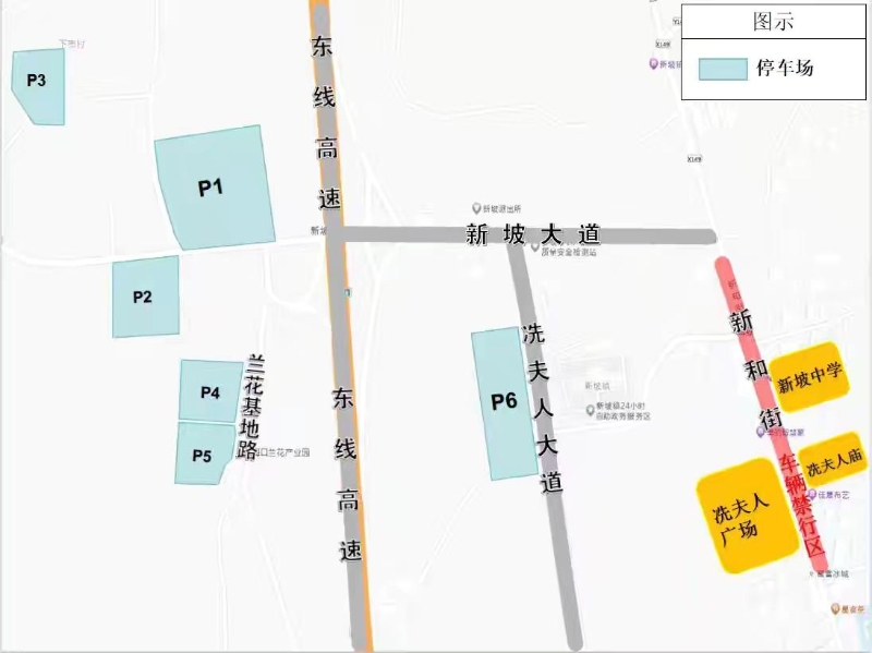 新坡镇共设置6个临时停车场,参加活动的车辆主要引导至P1、P2停车场停放,P1、P2停车场饱和后,再依序引导至P3、P4、P5、P6停车场停放,再乘坐摆渡车前往活动现场。
