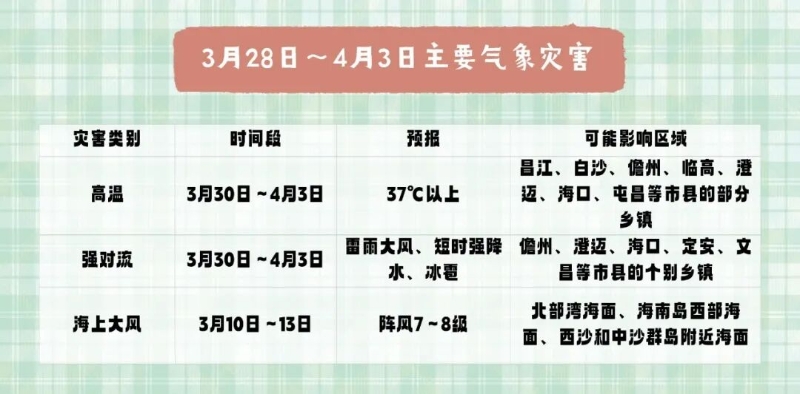 3月30日~4月3日,海南岛西北半部地区将有较大范围高温天气,五指山以北局地午后有阵雨或雷阵雨,个别乡镇可能伴有雷雨大风、短时强降水和冰雹等强对流天气,建议公众注意防暑降温,关注天气预警信息,避免长时间户外活动,强对流发生时及时采取防御措施,相关部门加强电力巡检工作。