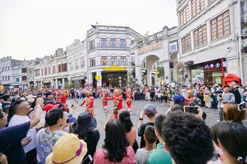 下午4时,海口骑楼老街人头攒动,“英姿展芳华”冼夫人主题巡游快闪活动热闹上演,一辆装饰古朴的巡游“战车”缓缓驶来,车上“冼夫人”与将士们身着戎装,神态威严,还原着千年以前安定南疆的巾帼风采。
