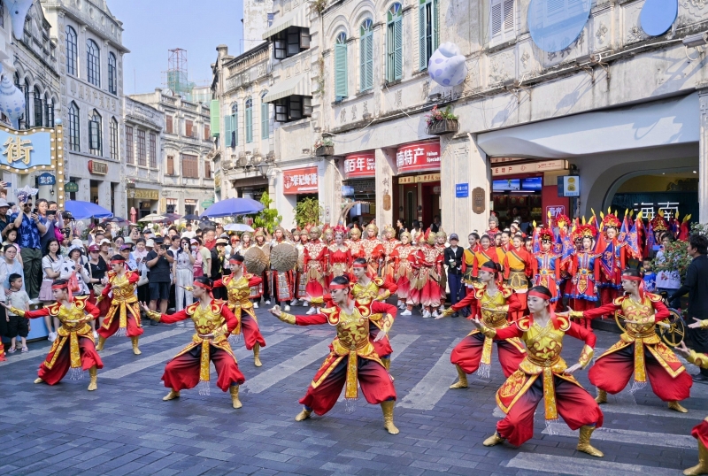 行进至老街核心区域,快闪环节正式开启,武术表演者腾挪跳跃、招式刚劲,一招一式尽显中华传统武术的精气神;巾帼舞者们身着战裙,以利落舞姿演绎“不让须眉”的巾帼气魄,将冼夫人“忠勇护国、仁爱护民”的精神融入肢体语言中。