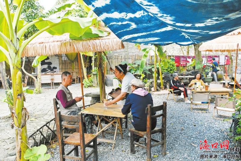 在海口秀英区石山镇道堂村委会三卿村内,游客在春风十里非遗小院品尝饮品。记者 石中华 摄