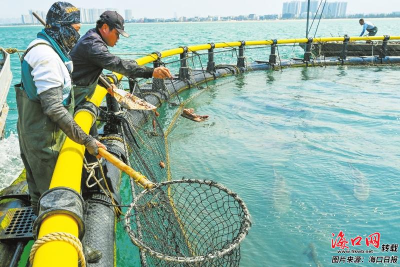 海口市荣山寮村海域,工作人员投喂网箱内养殖的海甘鲳。记者 石中华 摄