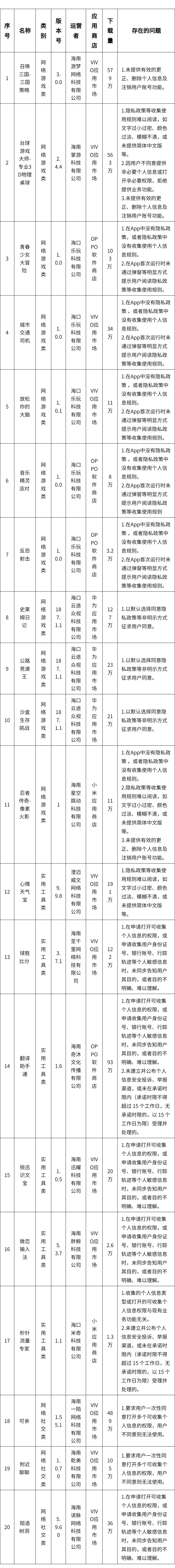 为深入推进海南省个人信息保护领域专项治理工作,近期,针对群众反映强烈的移动应用程序(包含App、小程序等)非法获取、超范围收集、过度索取权限等侵害公民个人信息的违法违规现象,海南省互联网信息办公室依据《中华人民共和国网络安全法》《中华人民共和国个人信息保护法》《App违法违规收集使用个人信息行为认定方法》《常见类型移动互联网应用程序必要个人信息范围规定》等法律和有关规定,组织对省内用户量大的移动应用程序收集使用个人信息情况进行了技术检测,检测结果显示“召唤三国-三国策略 ”“台球游戏大师-专业3D物理桌球”“青春少女大冒险”等20款移动应用程序均存在不同程度违法违规收集使用个人信息的行为,现将有关情况通报如下: