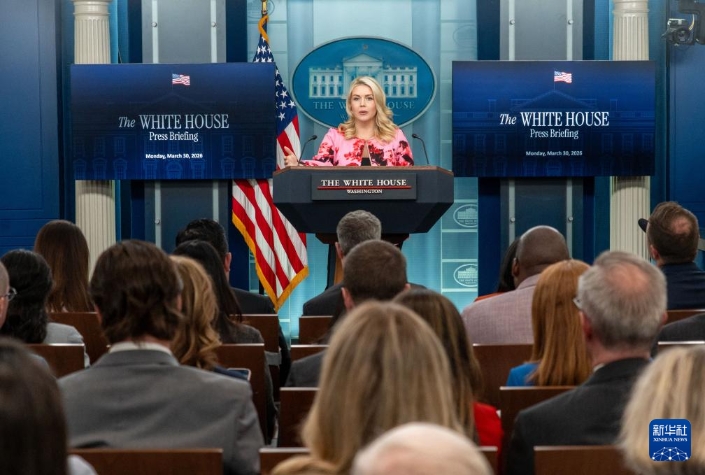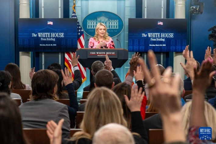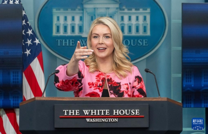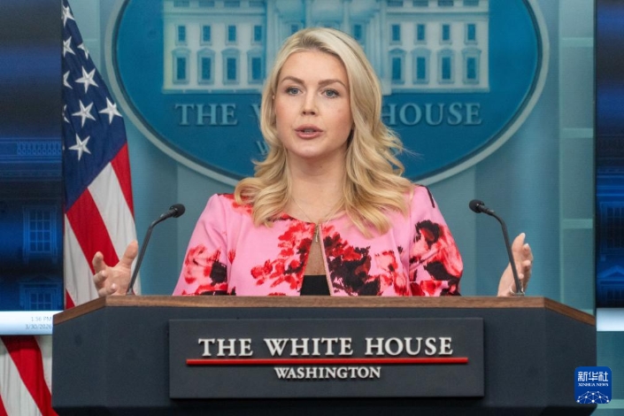 3月30日,在美国首都华盛顿白宫,白宫新闻秘书莱维特出席记者会。新华社发(李源清摄)