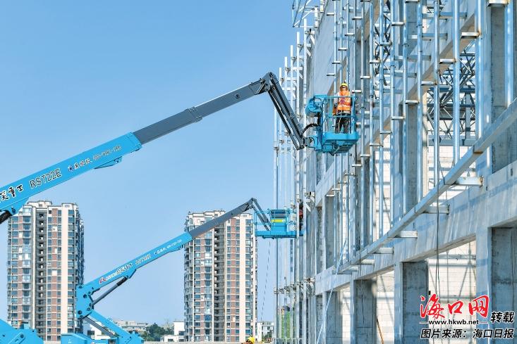 3月30日,海口金海高级中学项目现场,施工人员在进行外立面施工。记者 苏弼坤 摄