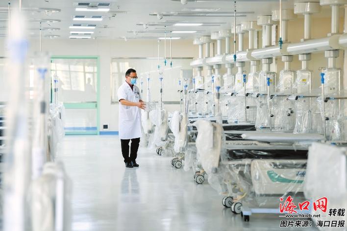 3月31日,在海南省老年医疗中心(一期)ICU综合大厅内,医务人员正在检查医疗设备。记者 苏弼坤 摄