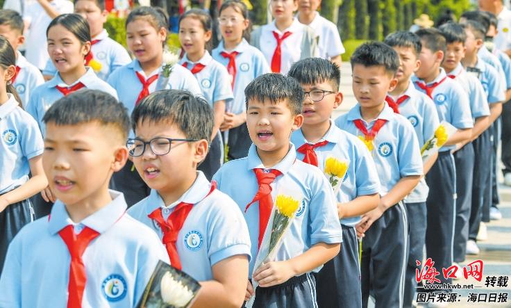 3月31日,学生们在海口金牛岭公园解放海南岛战役烈士陵园烈士纪念碑前整齐列队敬献鲜花。记者 康登淋 摄