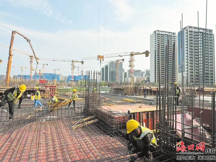 3月30日,在海口市横沟村城市更新项目二期施工现场,工人们正忙着开展钢筋绑扎、混凝土浇筑等工序。