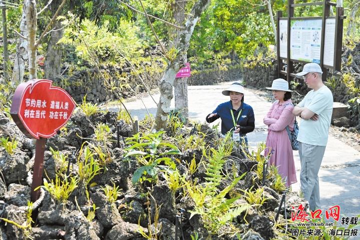 3月29日,在施茶村火山石斛园内,市民游客在工作人员的讲解下观赏石斛。