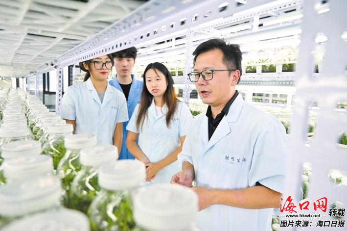 4月1日,在海南胜嵘生物科技石斛产业园,海南胜嵘生物科技有限公司研究人员余啸正和团队成员观察培养皿中的石斛组培苗,目光专注。“我们石斛产业园已具备年产种苗1.4亿株的生产能力,拥有国内石斛品种最齐全的种质资源。”余啸说。