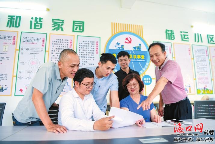 3月27日,在秀英区海秀街道长秀社区储运小区议事堂,小区党支部工作人员、业主和社区工作人员一起商讨如何为业主提供更多暖心服务。记者 苏弼坤 摄