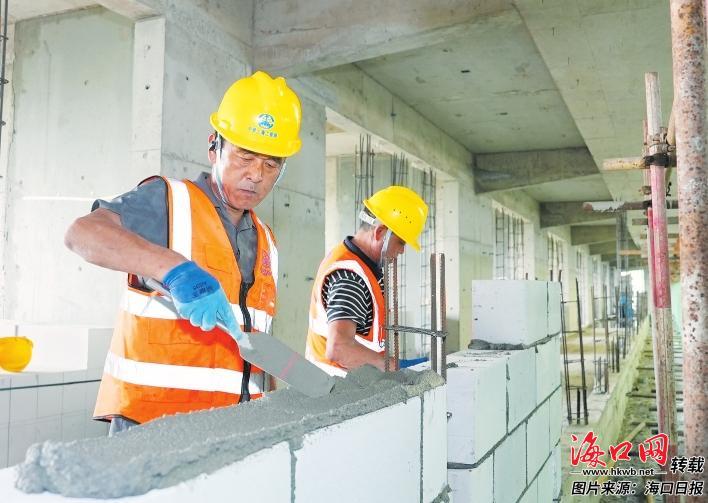 近日,海南师范大学桂林洋校区三期学生公寓(23#-26#)项目主体结构全面封顶,施工人员在室内各司其职开展工作。记者杨忠凯摄