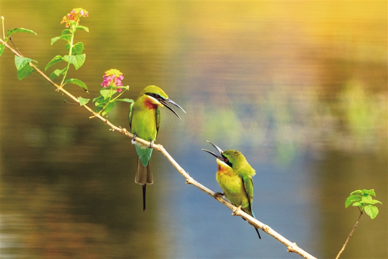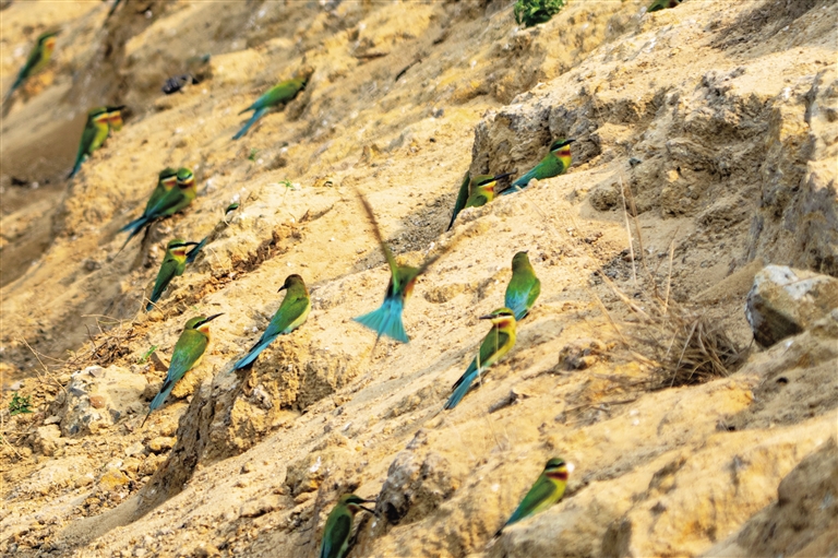 澄迈县花场村附近一处土坝之上,清脆婉转的鸣叫声打破静谧——有着“中国最美小鸟”美誉的栗喉蜂虎,近日再度携春而来。目前有近80只栗喉蜂虎齐聚于此,在海南开启一年一度的繁育之旅。