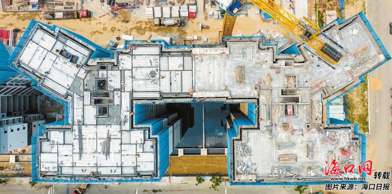 俯瞰位于海口江东新区综合服务组团的江东新区JDZH-04-F05地块项目,两栋住宅楼率先实现主体封顶。记者 杨忠凯 摄
