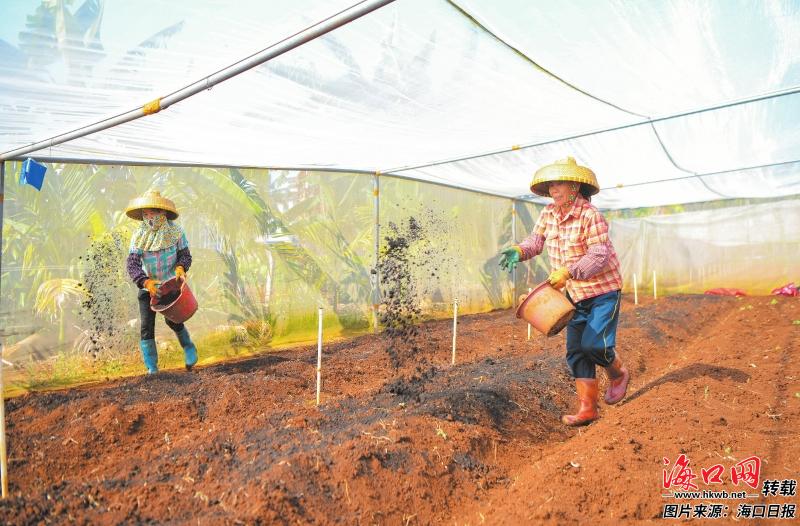 近日,在海南琼山蔬菜科技小院的蔬菜大棚内,农户正在施有机肥。记者 苏弼坤 摄