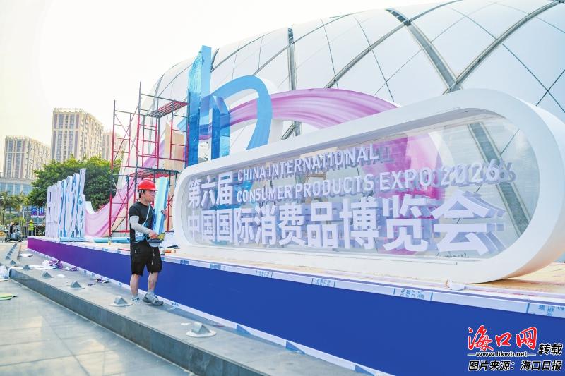 4月6日,在海南国际会展中心,工作人员正有序搭建第六届中国国际消费品博览会的相关场馆和展陈。