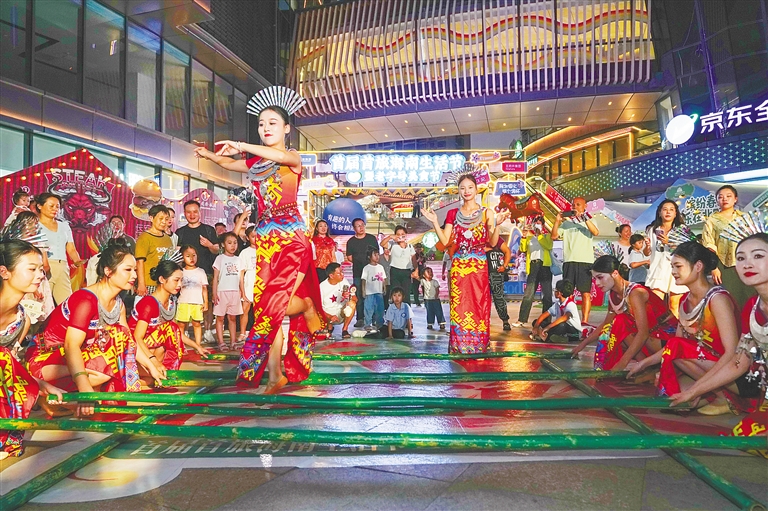 4月10日,首届首旅海南生活节暨老字号美食节在海口王府井海垦广场启动。据悉,作为第六届消博会的重要配套活动,首届首旅海南生活节暨老字号美食节活动将持续到4月19日,每日17时至22时开启集合市集、美食、音乐的夜间嘉年华,为消博会增添夜间文旅消费亮点。图为活动现场表演竹竿舞。