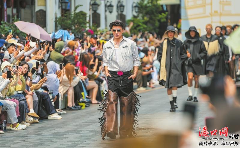 4月12日,2026海南青年国际时装周在海口骑楼老街启幕。图为海南青年国际时装周名誉主席胡兵领衔走秀,吸引市民游客驻足观看。记者 康登淋 摄