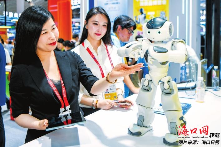 4月13日,在第六届消博会深圳馆内,客商与AI悟空智能机器人互动。记者 苏弼坤 摄