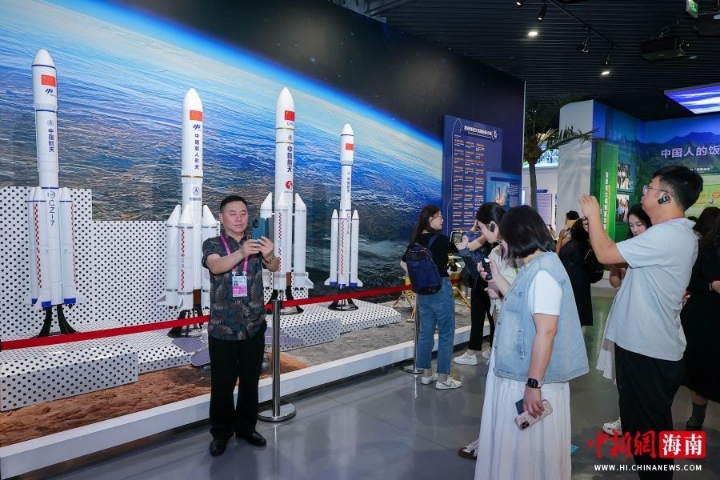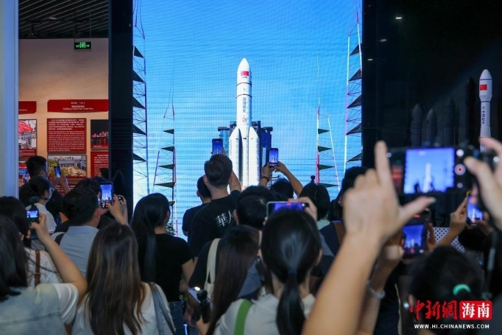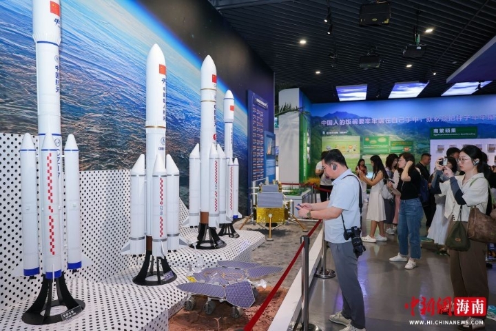 图为展出的多款火箭模型吸引采访团成员拍照打卡。骆云飞 摄