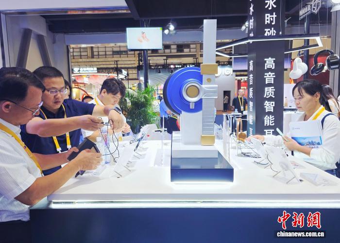 4月14日,第六届消博会现场,消费者在体验AI智能耳机。记者 王晓斌 摄