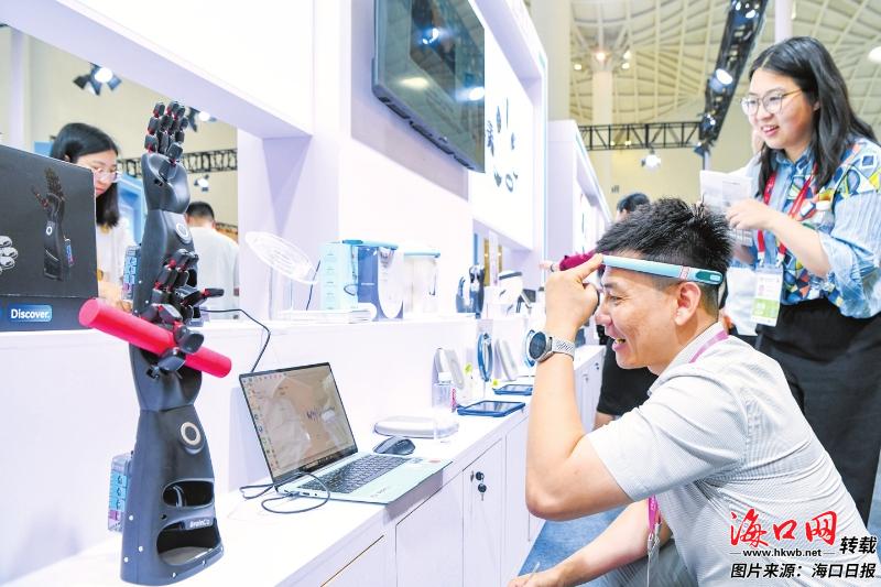 在第六届消博会智能产品及外贸优品展馆内,参展人员正在了解脑科学人工智能设备。记者 苏弼坤 摄
