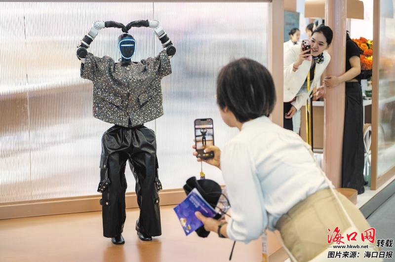5号展馆海控免税展台前,人形机器人在与观展人员互动。记者 石中华 摄