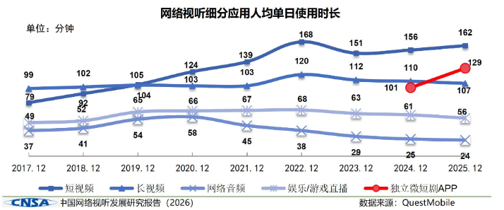 报告显示,2025年12月,网络视听用户人均单日使用201分钟,同比增长4.2%。其中微短剧人均单日使用129分钟,同比增长28.4%,超过长视频,位居视听细分应用第二位,仅次于短视频。