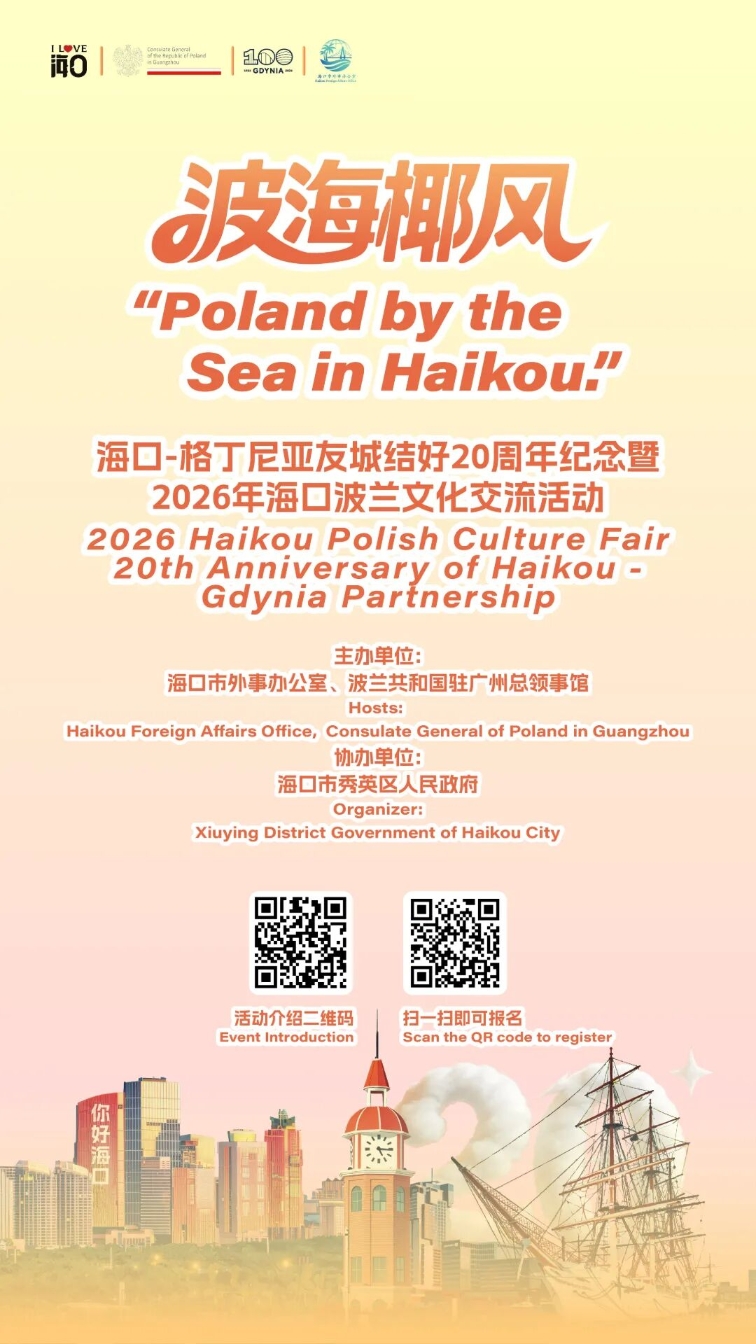 4月17日至18日,“波海椰风”海口—格丁尼亚友城结好20周年纪念暨2026年海口波兰文化交流活动将在荣山寮村戏台及沙滩精彩上演。这是一场家门口的、沉浸式的亚欧文化之旅,我们诚邀每一位市民游客,前来共赴这场跨越大陆的浪漫之约。