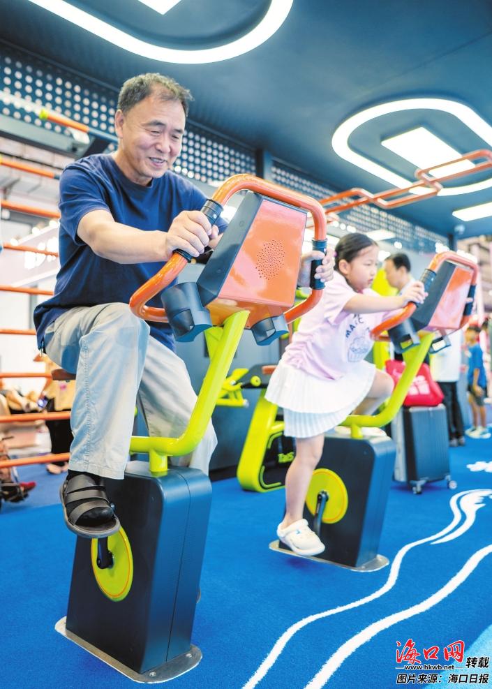 4月16日,观众在泰山体育展台体验智能健身单车。记者 石中华 摄