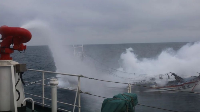 海警舰艇对失火渔船进行灭火