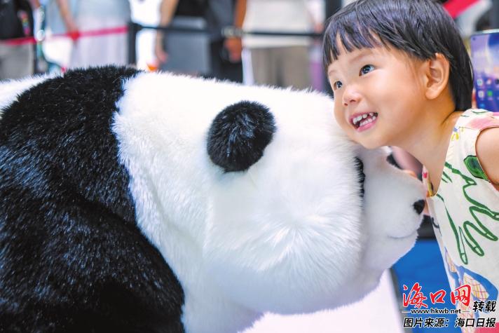 4月17日,在第六届消博会现场,小朋友与熊猫外形的智能机器人互动。